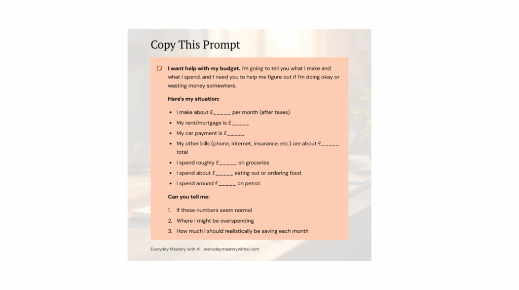 Here’s what you can literally copy and paste (just fill in your numbers & change to £ signs is in the Uk). First off, don’t overthink it, you’re just starting a chat, not building a spreadsheet. In other words, this is the simple starting point for your 15-minute ChatGPT budget.